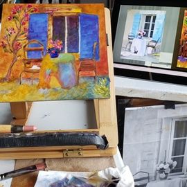 As I didn't have WiFi in my studio I had to paint in my living room for the online class. Here is my set up and first stage of the unfinished art piece. The pic on screen, as I follow along.