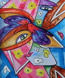 This is a wc study in using themed elements of Picasso's' work in my own design. I chose eyes and flowers for this piece.