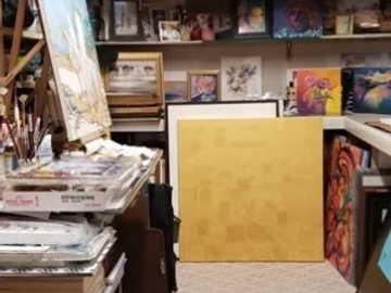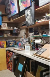 I had just won a major art award and then my back went out on me I couldn't walk for 6 mo. During this time my Hubby was busy in our garage making a surprise studio for me! This is the left side of my 16 x 14 studio.
